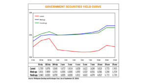 Debt yields, which move opposite to prices, went down by an average of 32.61 basis points (bps) week on week at the secondary market, data from the PHP Bloomberg Valuation Service Reference Rates as of Sept. 20 published on the Philippine Dealing System’s website showed.