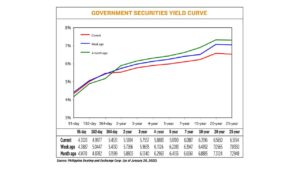 GS yields, which move opposite to prices, dropped by 23.44 basis points (bps) on average week on week, based on PHP Bloomberg Valuation Service Reference Rates as of Jan. 20 published on the Philippine Dealing System’s website.