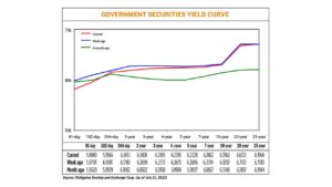 Bond yields, which move opposite to prices, declined by an average of 5.54 basis points (bps) week on week, based on PHP Bloomberg Valuation Service Reference Rates as of July 21 posted on the Philippine Dealing System’s website.