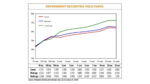 GS yields at the secondary market fell by an average of 13.42 basis points (bps) week on week, based on the PHP Bloomberg Valuation (BVAL) Service Reference Rates of Jan. 27 published on the Philippine Dealing System’s website.