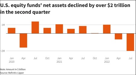 July 18 (Reuters) – US equity funds witnessed a record erosion in their net assets in the second quarter of this year, as stocks slumped due to soaring inflation and rising expectations of aggressive rate hikes by major central banks.